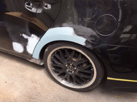 その次に下地処理剤のサフェーサーを塗布します。サフェーサーを塗布する目的は、防水・防錆効果を得るためと、またパテが塗料を吸い込まないようにシールするためです。